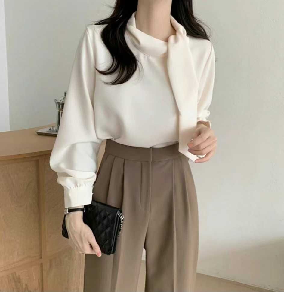 daily project "新品" Pleated High-Neck Blouse (Ivory, Beige)