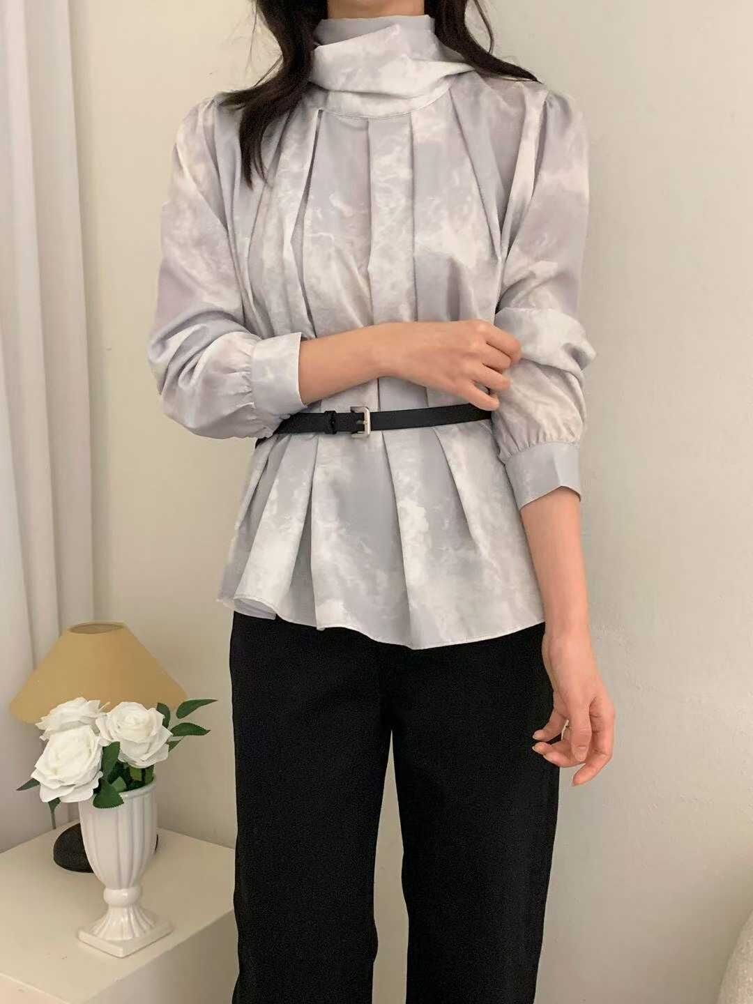 OPN "新品" Neck Tie Wrinkle Top (Beige, Blue)