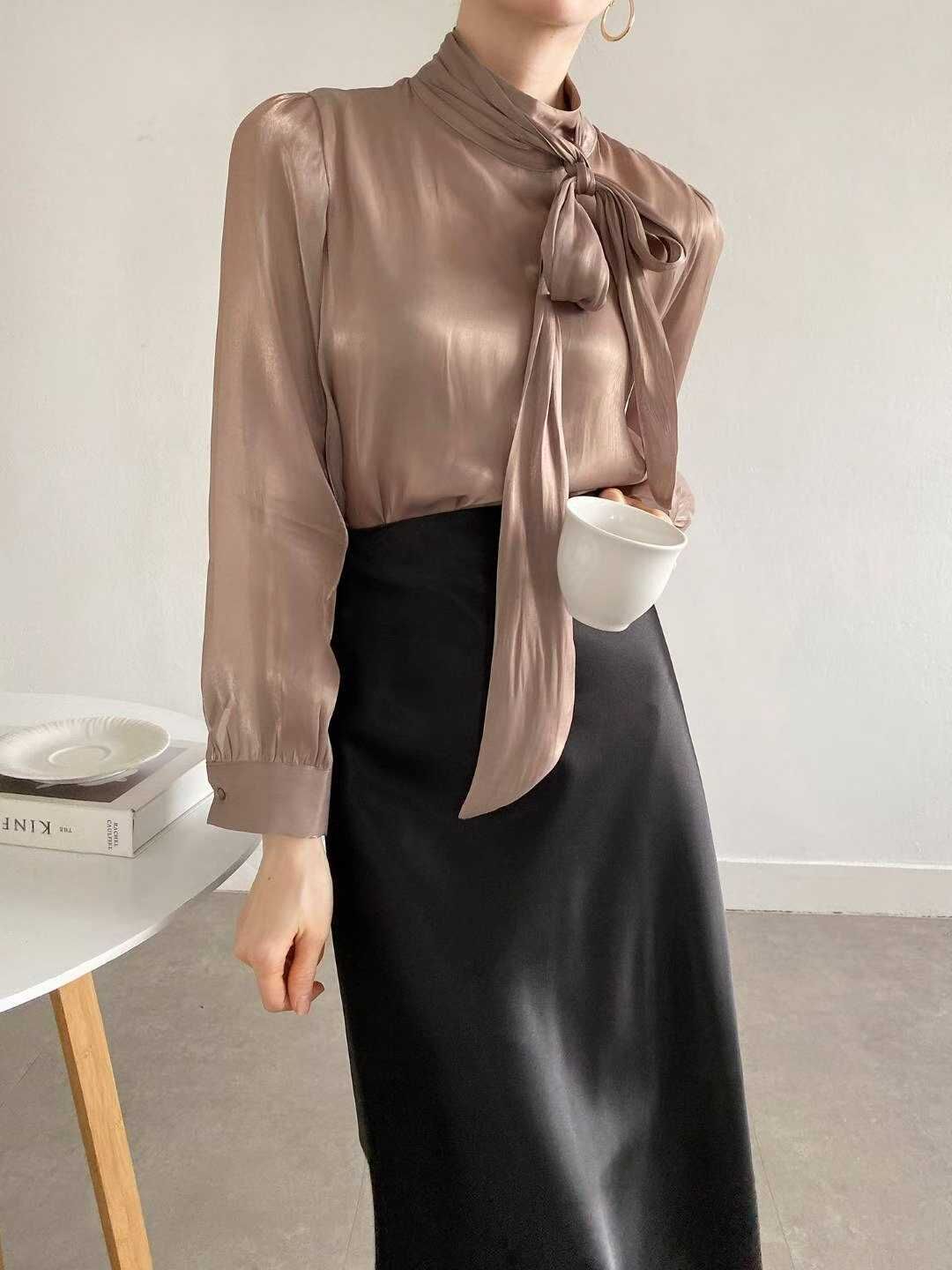 OPN "新品" Silky Neck Tie Blouse (Brown, Yellow)