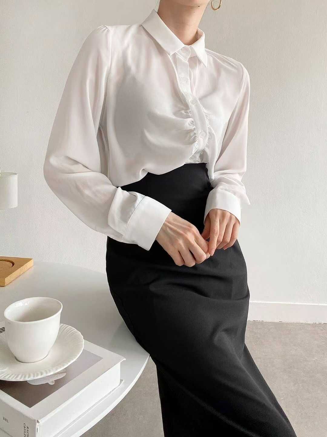 OPN "新品" Shirring L/S Blouse (White, Black)